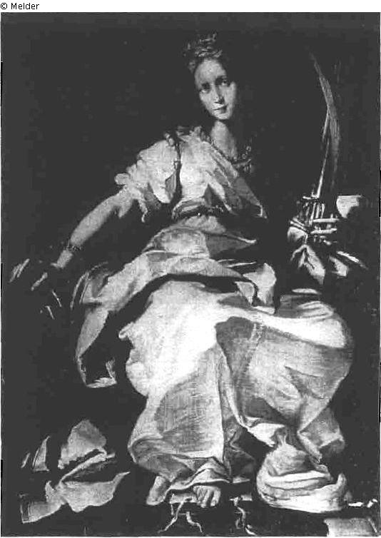 Heilige Katahrina mit Myrthenzweig auf einem Thron, Teil des Rades als Zeichen ihres Martyriums