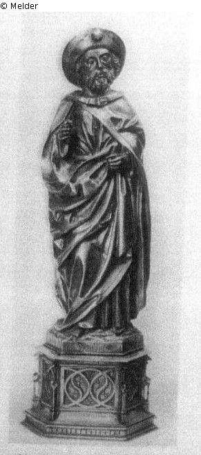 Auf sechkantigem Sockel mit getriebener Masswerkdekoration steht der heilige Apostel in faltenreichem Mantel mit Pilgertasche und Pilgerhut. Am Sockel die Jahreszahl 1492 und Inschrift: Wernhaut Kral (Name des Stifters). Gutachten von Geheimrat O. von Falke