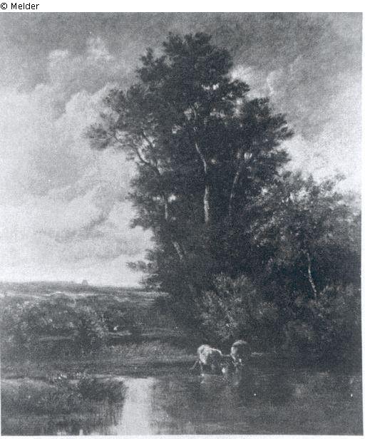 Herbstlandschaft. In einem Teich unter hohen Bäumen zwei Kühe. Im Hintergrund eine Windmühle. Hoher bewölkter Himmel. Öl auf Lwd. Bez. rechts u.: Jules Dupré. 65x53cm