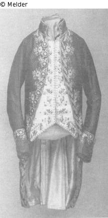 Frack aus schwarzblau schmal gestreiftem Seidengewebe und weißem Seidenfutter. Stehkragen, Vorderkanten, Ärmelaufschläge und Schöße tragen als Randverzierung ein gesticktes reglehaftes Blumenmuster mit verschiedenen weißen, roten und hellblauen Blüten. die großen, flachen mit Seide bezogenen Knöpfe sind gleichfalls mit einem Blumenmotiv bestickt.