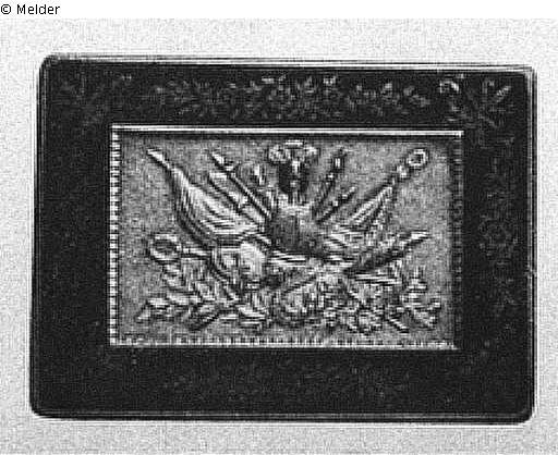 Hohe Golddose, rechteckig, königsblau emaillierte Flächen über guillochiertem Grund, ausgespart Blütenzweige. Im Deckel als Mittelstück Trophäenbündel "á quatre couleurs" über gepunztem Grund. Paris. Das Email etwas ausgebessert.