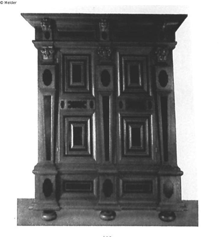 Mit reichen Ebenholzeinlagen. Profilierter Sockel auf Kugelfüßen, darüber zwei Torflügel zwischen drei Pilastern mit geschnitzten Kapitellen. Vorkragendes profiliertes Gesims mit drei geschnitzten Löwenköpfen. Holland.
