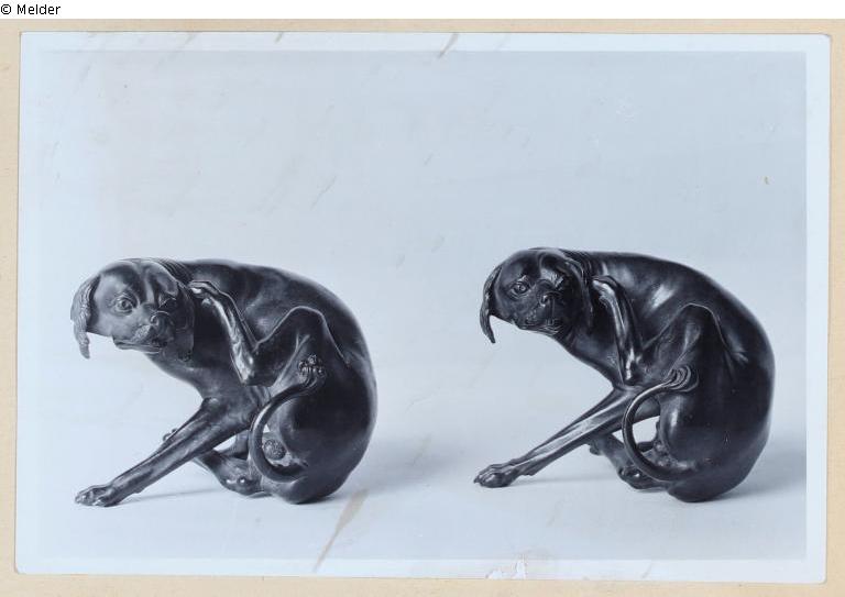 Ein sich hinter dem Ohr kratzender Hund, Kleinplastik aus Bronze