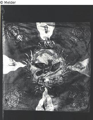 Tuch: Gelb. 1898 auf Netzwerk appliziert. Mittelfeld weiß mit zur Sonne fliegendem Adler, blaues Devisenband "NON SOLI CEDIT". Umkränzt von Palmwedeln mit Krone. Vier weiße Keile mit flammender Granate. In den Ecken Monogramme "FC" (Friedrich Cronprinz) umgeben von Palmkranz mit Krone. Nagelung: Oberkranz 4 Reihen, insgesamt 46 Nägel. Unterkranz nebst Wicklung. 10 Nägel als Längsstreifen. Tuch: 118 cm lang, 113 cm breit; Stange mit Spitze und Schuh: 290 cm lang