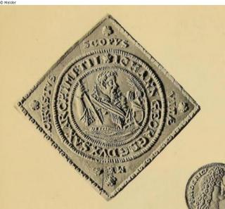 Johann Georg I. von Sachsen. 1611/1656. Goldene Klippe auf das Armbrustschiessen zu des Prinzen August Geburtstag. Zu 6 Dukaten. Vorders.: Brustbild Johann Georgs. Rücks.: Kurschwerter.