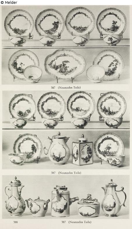 Gelber Grund mit asiatischen Blüten. In zwei Reserven Hafenansichten mit Kaufleuten. Schwertermarke. Am Ausguß geringe Verbesserungen.