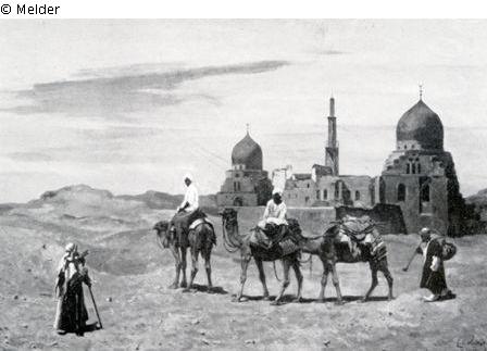 eine Karawane nach dem Weg fragend, im Hintergrund zwei Moscheen; bez.: Emile Wauters le Caire