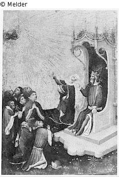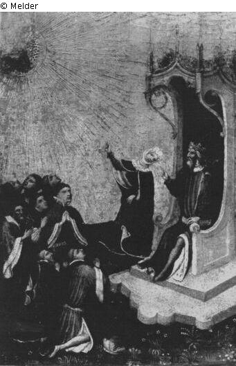 Auf Wiesengrund der Thron des Kaisers, gegenüber kniend sein Gefolge, Sibylle neben dem Thron stehend, mit dem rechten Arm auf Maria mit Kind in der Strahlenglorie deutend.