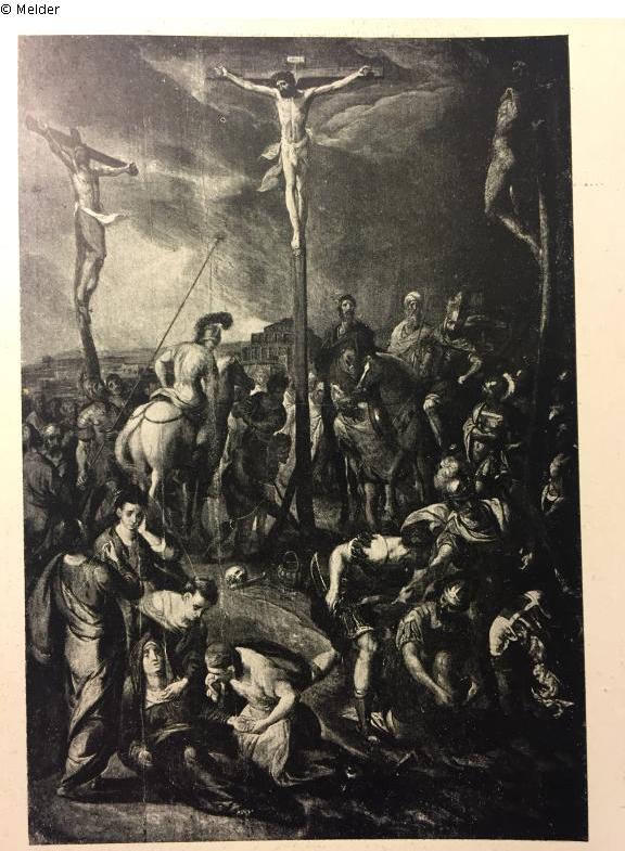 Against a dark stormy sky and buildings of Jerusalem at the horizon are three tall crosses with the crucified, surrounded by a crowd. In the foreground is a fainting Madonna, supported by Mary of Kleops.