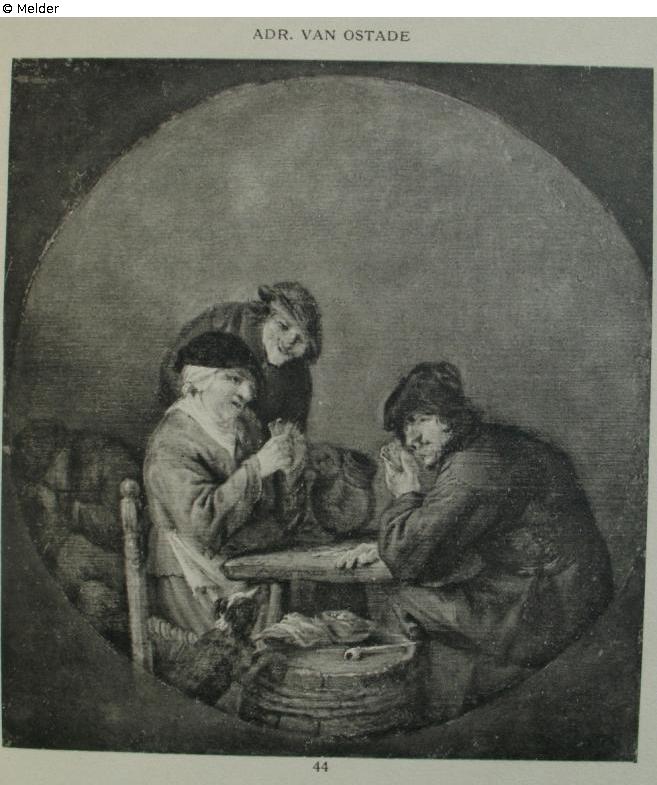 rund. Ein Bauer mit blauer Weste und eine Bäuerin in einer braunen Robe spielen Karten an einem Tisch. Ein Mann mit Krug steht dahinter. Im Halbdunkel ein weiterer schlafender Mann. Im Vordergrund ein Hund, eine Tonne, eine Pfeife.