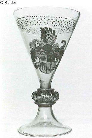 Fuß mit umgeschlagenem Rand, Knauf geriffelt, zwischen Ringscheiben. Die trichterförmige Kuppa zeigt um den Lippenrand 5fach Punktreihung und beiderseits das Wappen der Herren von Neuhaus.