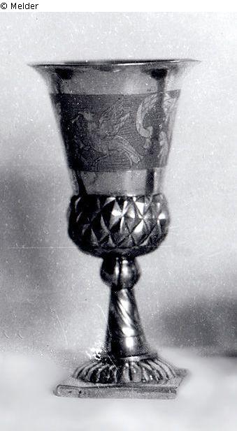 Kelchbecher, Fuss und unterer Teil des Kelches getrieben und etwas ziseliert, um den Kelch ein ca. 4 cm breites gepunztes und ziseliertes Band mit ornamentalen Blattwerk und Adler. Silberzeichen.