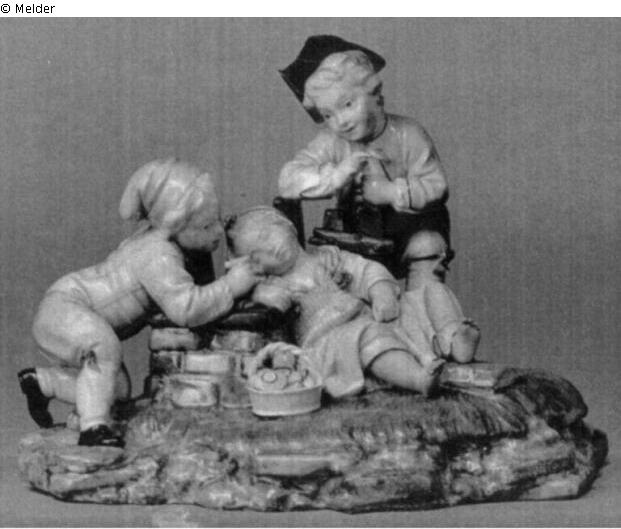 Ein kleines Mädchen ist im Sitzen eingeschlafen. Sein Kopf liegt auf dem rechten Arm, der sich auf einen gemauerten Steinsitz stützt. Neben ihm kniet ein kleiner Knabe, der es mit einer Feder im Gesicht kitzelt. Hinter dem Mädchen steht ein kleiner Knabe, der es mit einer Feder im Gesicht kitzelt. Hinter dem Mädchen steht ein zweiter Knabe, der sich über einen niedrigen Zaun beugt und die Szene beobachtet. Vor dem Steinsitz steht ein Henkelkörbchen mit einer Puppe als Wickelkind, einem Puppenkopf und golden gerändertem Geschirr. Das Mädchen trägt ein weißes Häubchen mit gelbem Rand. Halstuch, Schürze und Kleid sind in zartem Hellblau und Rosa gestreift. Die Füße sind bloß. Der knieende Knabe trägt eine rosa Zipfelhaube, rosa gestreifte weiße Jacke, blaßgelbe Kniehosen mit blauen Schleifen, weiße Strümpfe und schwarze Schnallenschuhe, der Stehende einen schwarzen Dreispitz, golden geränderte Jacke und Kniehosen in Rosa, weiße Strümpfe und schwarze Schnallenschuhe. Über dem grau und bräunlich staffierten Steinsockel liegt eine grüne Grasdecke. Blaumarke Rad. Ritzzeichen. Füße des rückwärts stehenden Knaben gekittet. Feder abgebrochen. Höchster Porzellan.