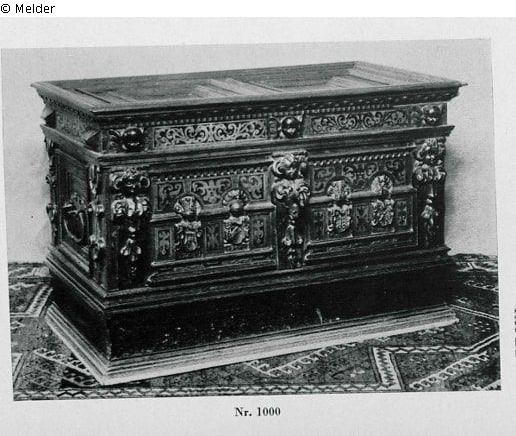 Hahn 1940: mit sehr fein geschnitzten Karyatiden, geflügelten Engelsköpfen und vier Wappen mit Helmzier. Die Flächen geziert mit reichen Intarsien. Kassettierter Deckel. Eiche, Nuß- und Kirschholz. Nürnberg gegen 1600. In vorzüglichem Erhaltungszustand; "1 kleine Truhe mit Einlagen und geschnitzten Figuren, Renaissance"
