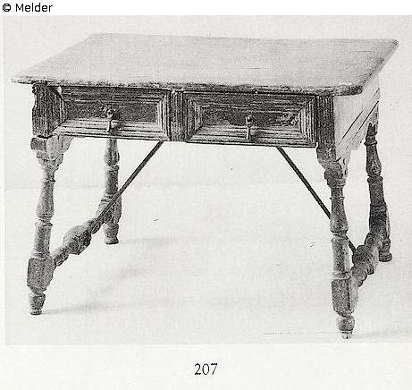 Helles Nußbaum. Die schlanken, gedrehten, schrägstehenden Beine mit seitlicher Stegverbindung, an Eisenstäben, zum Umklappen. Zwei Schubfache nebeneinander mit feinprofiliertem Rahmen. Alte bewegliche Griffe. Quelle: Hugo Helbing Kunsthandlung und Kunstversteigerungshaus: Kunstbesitz eines Berliner Sammlers. Katalog Nr. 49. (DOI: Externer Link)