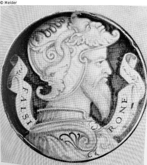 kleiner Teller, bemalt in Blau, Gelb und Grün mit bärtigem, ganz im Profil gesehenem Kriegerkopf,auf dem Haupt ein reich geschmückter Helm, auf dem blauen Grund Spruchban: FALSIRONE.