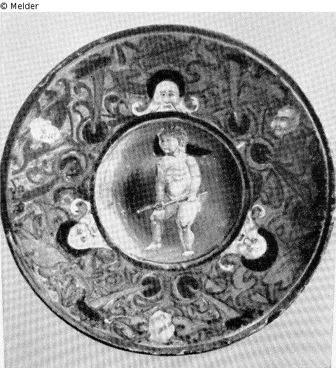 kleiner Teller mit breitem Rand und muldenförmigem Spiegel.Rot und perlmuttfarben lüstriert. Auf dem Rande symmetrisch angeordnete Arabesken, ocker, grün, braun auf blauem Grund. Im Spiegel Putto mit Lanze. Gekittet.