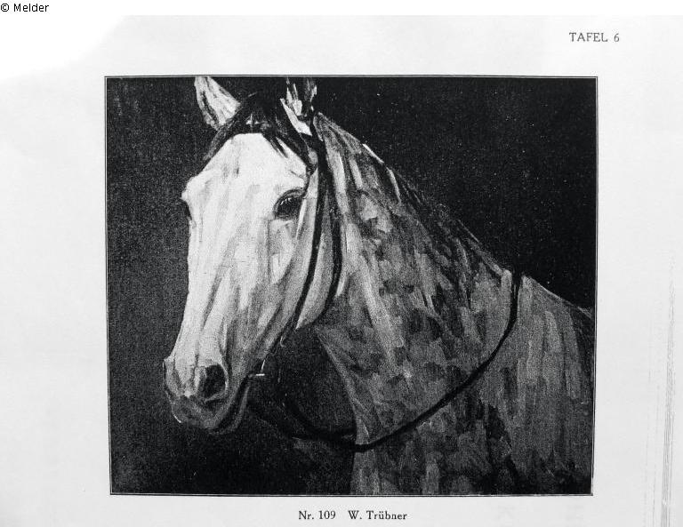 Pferdekopf, lebensgroßer Kopf und Hals eines Schimmels, fast Profil von rechts nach links.