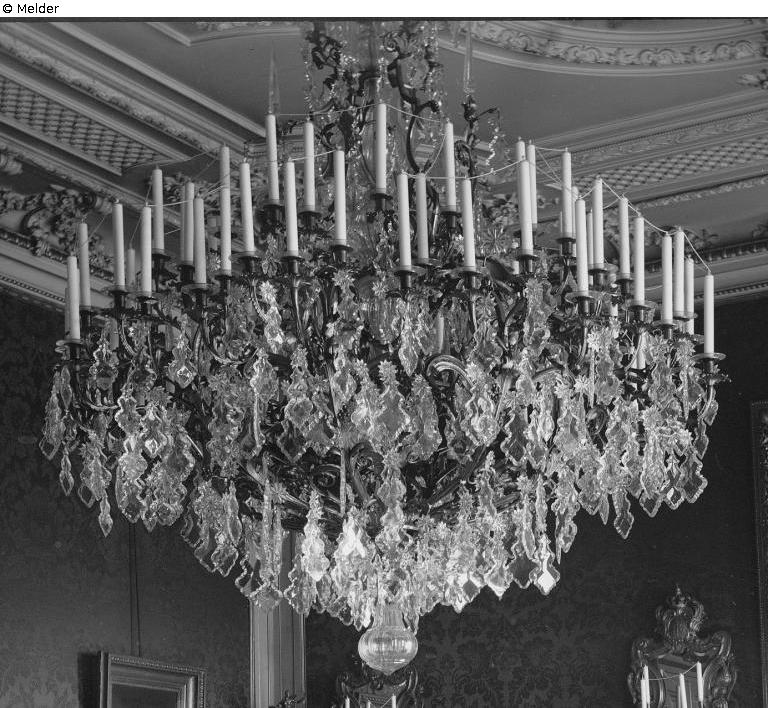 Dresdner Schloss, 1. OG Georgenbau, Audienzzimmer des Königs; Im Inventarverzeichnis Nr. 1 vom 31.01.1920, als Bestandteil des Auseinandersetzungsvertrages des Freistaates Sachsen und dem vormaligen Königshaus von 1924, wird im „Audienz- Zimmer“ „1 Bronzekronleuchter mit Prismen“ aufgeführt, welcher „vom Staate angekauft“ wird; Ein genauer Bergungstermin ist nicht aktenkundig, die Bergungsmaßnahmen wurden im Sommer 1944 beendet. Der Kronleuchter des Audienzzimmers wurde eventuell mit diesem Transport vom 26.04.1944 ausgelagert und nach dem Bergungsort Schloss Rammenau verbracht. Die Aufzählung „13 verschalte Leuchter bezw. Leuchterteile…“ lässt diese Vermutung zu. Zu den Verlustumständen dieser Objekte ist nichts bekannt. Ein Verlust im Zusammenhang mit den Ereignissen des 2. WK wird vermutet.