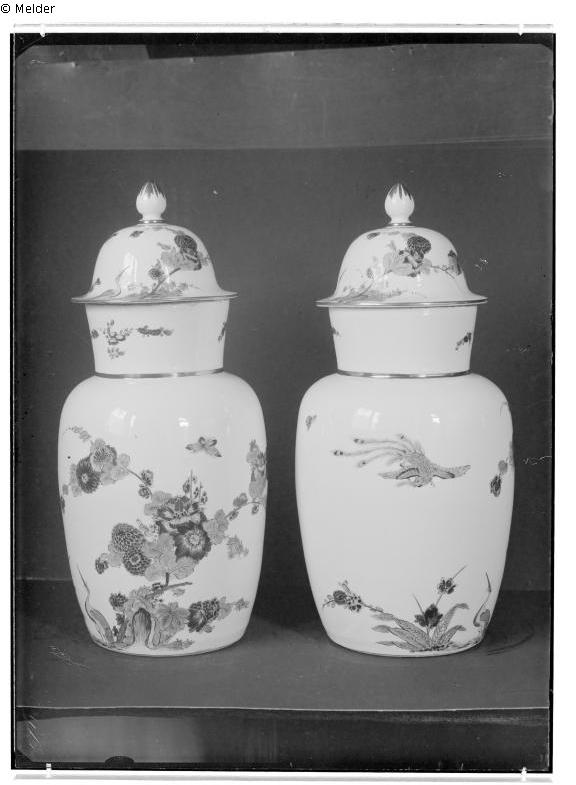 Der Deckel der linken Vase ist erhalten: SKD, Porzellansammlung, Inv.-Nr. PE 665 b, Maße: H. 11,5 cm, D. 15,6 cm.