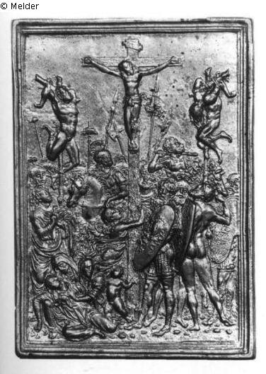 Rechteckige Plakette, mehrfach profilierter Rahmen. Das Kreuz mit der auffällig kleinen Christusfigur erhebt sich in der Mitte zwischen denen der beiden Schächer. Maria Magdalena umklammert den Schaft des Kreuzes. Links wird Maria von zwei Frauen gestützt, dahinter ringt Johannes die Hände. Rechts stehen Soldaten mit Schilden, im Hintergrund sieht man weiteres Kriegsvolk, darunter zwei Berittene. Einer von ihnen holt mit einem Knüppel zum Schlag gegen einen Schächer aus. Ein signiertes Exemplar dieser sehr verbreiteten Plakette ist nicht bekannt. Die Gesamtkomposition wurde von Ercole de' Robertis (heute zerstörtem) Fresko von ca. 1482/86 in der Garganelli-Kapelle von San Petronio in Bologna übernommen, die beiden Schächer wohl von einem Stich des "Meisters mit den Banderolen", tätig um 1450/75 in Nürnberg (?). Die Rückenfigur des nackten Kriegers gleicht der auf der Auferstehungsplakette Modernos (Nr. 91).