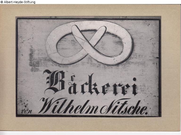 Holztafel, weiß gestrichen mit schwarzen Rahmen, darauf eine goldene Bretzel und die zweizeilige Beschriftung „Bäckerei / Wilhelm Nitsche.“ Schenkung von Bäckermeister Nitsche am Markt 1 in Luckenwalde (1927).