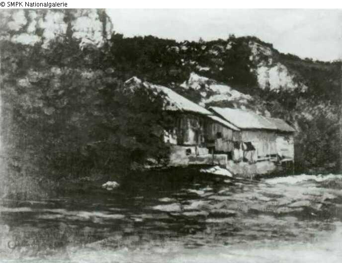 Tafelmalerei: Bild: Fluß & Wassermühle in einer Landschaft & Felsen & Wald