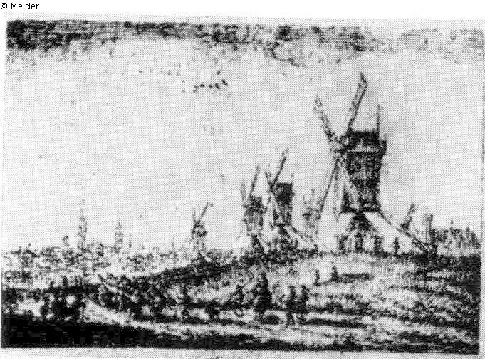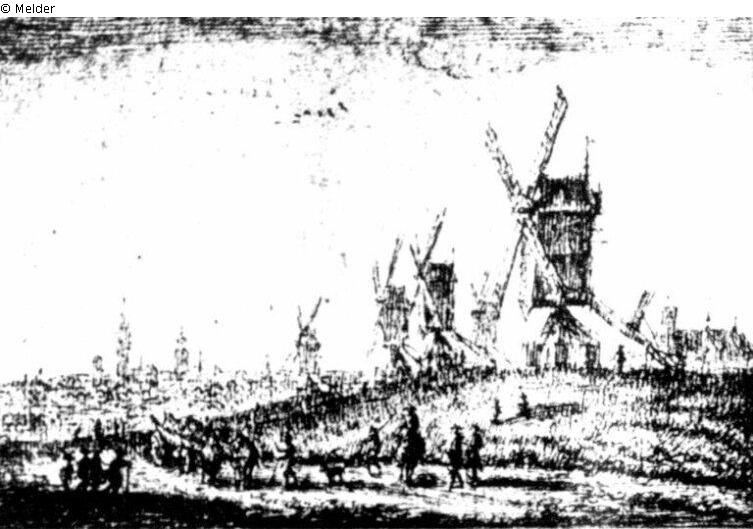 Links ein belebter Weg mit einem Landwagen, im Hintergrund die hochgetürmte Stadt. Rechts eine kleine Anhöhe mit 5 Windmühlen. Signatur: Links unten: g. neyts f. Feder in Braun.
