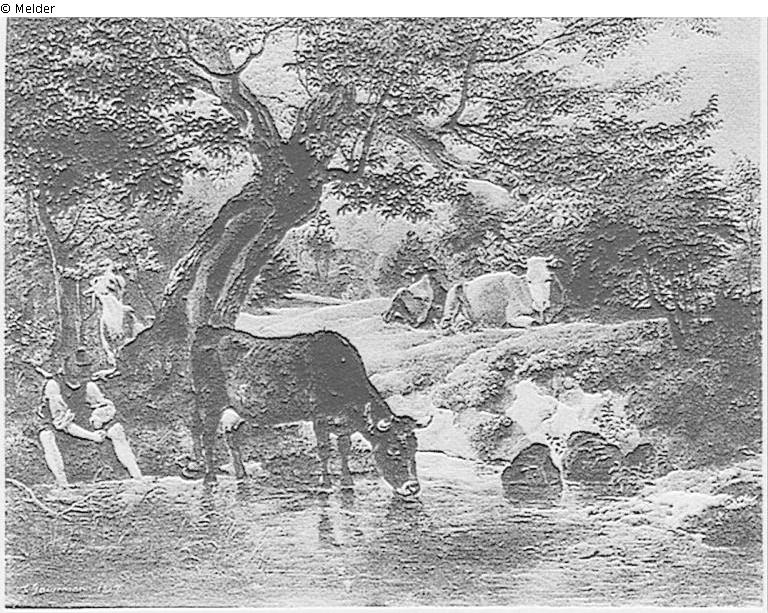 Ein großer Nussbaum macht einen Schatten. Im Wasser steht eine Kuh, auf dem Grunde daneben liegen ein paar Kühe; ein Knabe sitzt beim Wasser. Bez. u. dat. rechts unten: F. Gauermann 1827