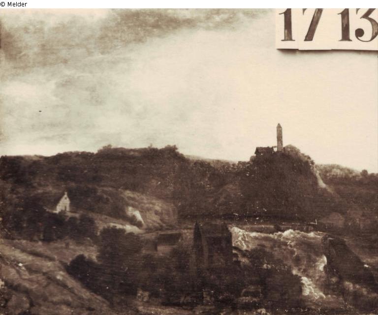 Am Wasserfall (Vordergrund rechts) steht ein kleines Haus. Viel Wald und Busch im Hügelgelände. Auf einem bewaldetenschroffen Hügel hinter dem Wasserfall steht ein Schloß mit einem hohen Turm. [...], Links unten voll bezeichnet; auf der Rückseite Aufkleber mit Inventarnummer und Siegel