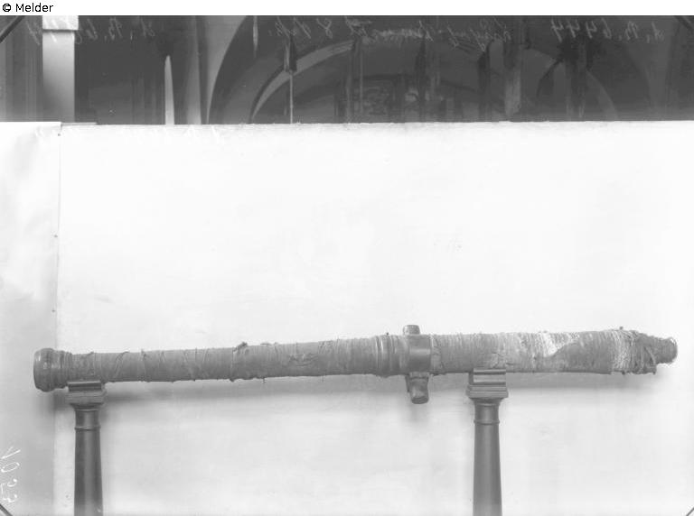 kupfernes Seelenrohr, umwickelt mit Bindfaden, Leinwand, Hanfstrick und Sackleinwand. Gedrehte hölzerne Mundfriese auf die Mündung geschoben. Schildzapfen aus Holz. Angeblich von französischen Einheiten aus Stralsund mitgenommen, 1815 aus Paris nach Berlin verbracht. Abmessungen: Gesamt: L 216, Kal. 6,1.