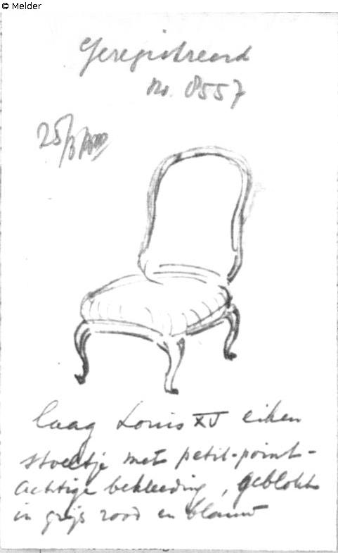 Quelle: Algemeen Politieblad van het Koninkrijk der Nederlanden, Jg. 95, Nr. 34, 30. November 1946 publizierten Liste 719 „Te ‘s-Gravenhage ontvreemd in 1943/1944, hollandsche teekeningen, t. w.“; Intern Aangifte Formulier vom 25.3.1946, BArch Koblenz B 323/2 fol. 153 mit eigenhändiger Skizze von F. Lugt;