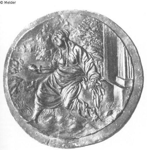Runde Plakette, ringsum flacher Randstreifen. Lucretia in Hemd und Umhang sitzt auf einem niedrigen, an ein Gebäude anstoßenden Mauerstück. Mit der rechten Hand stößt sie sich den Dolch in die Brust. Im Hintergrund sieht man ein Flußtal mit bergigen Ufern. Die Plakette gehört zu einer Folge von vier berühmten Frauen des Altertums.