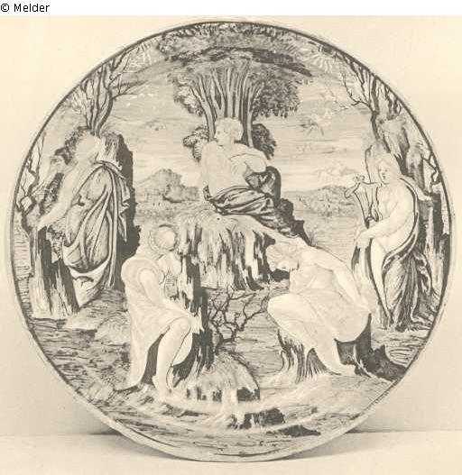 A FINE GUBBIO LUSTRE DISH, painted by Fra. Xanto Avelli, with the Naiades being turned into islands (Echinades) taken from Ovid, Met. VIII, v. 576-588, in rich blue, green, orange and yellow, typical rocks and a distant view of a city finely lustred, the back with lustre scrolls and inscription " 1532. Echinade gia nimphe, hoi scogli i mare. Nel IX L. Ovidio met " and below the signature "fra : Xato • A ? da • Rovigo ? i Urbino ", circa 1532