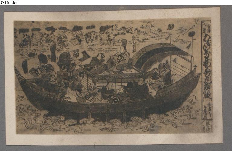 Auf einer Lustyacht sitzt der Fürst Yoritomo auf erhöhtem Mitteldeck mit Begleiterin; Würdenträger haben auf gewöhnlichem Deck Platz.