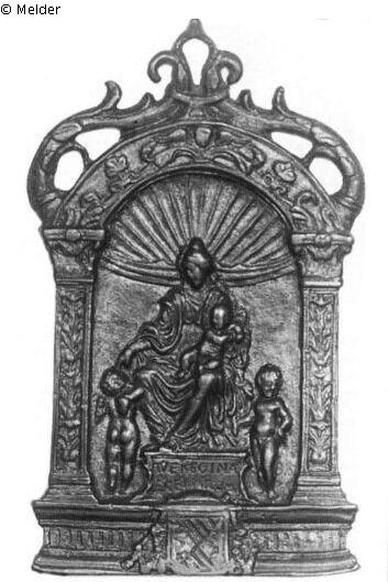 Kußtafel. Die Madonna mit dem Kind auf dem Schoß sitzt auf einem geschweiften Sockel mit der Inschrift AVE REGINA / : CELORVM in einer Muschelnische. Zu beiden Seiten des Sockels steht je ein nackter Putto. Die Rahmung besteht aus einer Basis mit einem Kardinalswappen in der Mitte, seitlich zwei ornamentierten Pilastern mit Kapitellen und darüber einem Bogen mit Pflanzenornamenten. Zwei geschweifte Ranken, die an den Enden miteinander verbunden sind, bilden den oberen Abschluß. Das Stück diente als Kußtafel, der Griff ist aber abgebrochen. Die Plakette tritt bis über die Mitte des 16. Jahrhunderts in zahlreichen Rahmungsvarianten als Kußtafel auf. Manchmal sind zwei schwebende Engel hinzugefügt, die eine Krone über Maria halten (z. B. in den ehemaligen Slgn. Thewalt und Gutekunst). Es gibt sie aber auch als einfache rechteckige Tafel ohne jedes Beiwerk (vgl. Nr. 104). Auf einigen Exemplaren fehlen dem linken Knaben die Flügel. Die Inschrift auf unserer Tafel ist die gebräuchliche, es finden sich aber auch solche mit Stifternamen, wie in der Skulpturensammlung der Berliner Museen: PIERO ? FRAN / C ? MALIPIER / O ? und in der Kress Collection in Washington: FLAVIVS ? CICO / L ? MEVANAS ? / 1552, die auf Venedig als Entstehungsort hinweisen. Ein ehemaliges Exemplar der Slg. Dreyfus trug die Inschrift A.P.M.