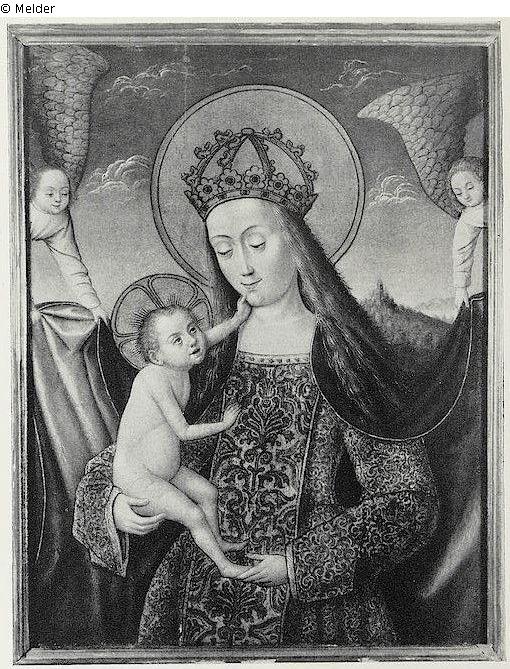 Madonna in Halbfigur mit Kind vor einer Draperie die von zwei Engeln gehalten wird