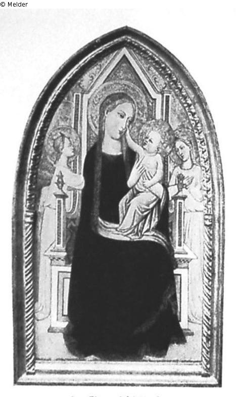 Auf einem farbigen Thronsessel sitzt die Madonna in rotem Gewand mit blauem, grün gefüttertem, mit Goldborte besetztem Mantel. Auf ihren Knien hält sie das in einen hellroten Mantel gekleidete Christkind, das mit der rechten Hand die Wange der Madonna berührt. Rechts und links je ein stehender anbetender Engel in hellgelbem Gewand. Goldener Rahmen. Gutachten: van Marle, 14.12.1928 und Adolfo Venturi, 11.1.1929. Aus Pariser Besitz.