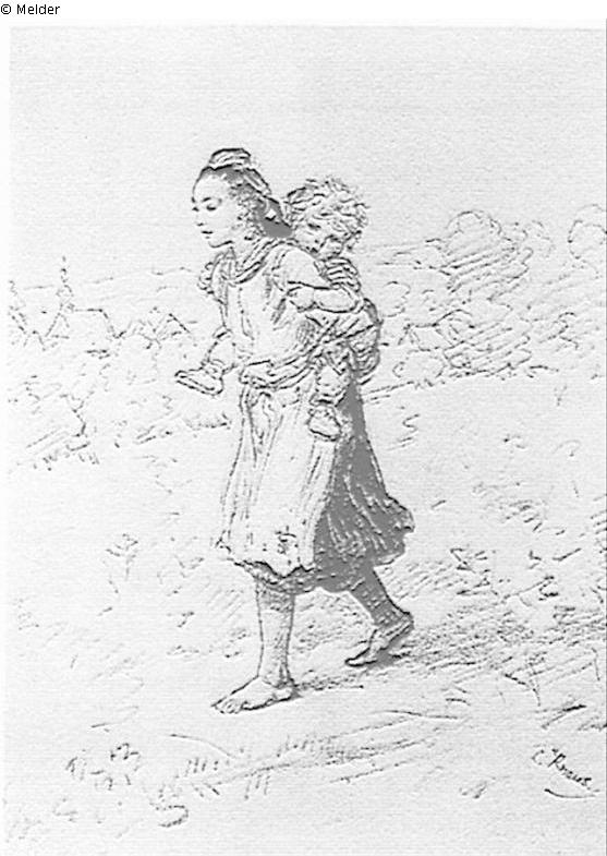 Mädchen aus der Schwalm, ihr kleines Schwesterchen auf dem Rücken tragend