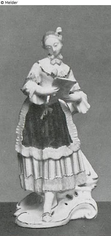 Mädchen mit Notenblatt. Stehend hält sie das Blatt in beiden Händen und blickt auf die Noten. Sie trägt ein kupfergrünes Häubchen auf dem von schwarzer Schleife gebundenen Haar. Um den Hals eine Perlenkette mit purpurrosa Schleife. Ebensolche Schleifen am Ausschnitt und den Ärmeln der hellgelben Taille. Blauweiß gestreifter Rock mit purpurrosa Volant, schwarze Schürze mit purpurrosa Besatz. Gelbe Schuhe mit blauen Säumen. Die Rocaillen des Sockels sind mit Gold gehöht. Eingepreßter Weckenschild (sichtbar auf dem Sockel). Modell von Franz Anton Bustelli