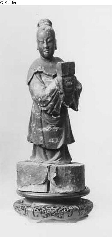 kleine vermutlich hölzerne Statuette auf einem runden Sockel stehend.