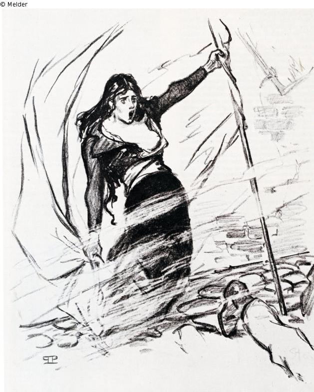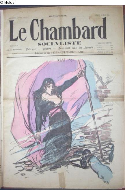 "Luise Michel von der ‚Gesellschaft zur Erkämpfung der Frauenrechte’ schwenkt als Marianne die rote Fahne über einer Barrikade, die im Mai 1871 von der Commune errichtet wurde. Rechts im Vordergrund ein Bein, einer ihre Kampfgenossen wurde erschossen. Dieses Motiv übernahm Steinlen von dem Barrikadenbild Manets. Ein Korrespondent der Zeitung „Le Droit“ schrieb über Luise Michel: ‚Unsere Poeten, Romanschriftsteller, Moralprediger und Dramatiker, die bis dahin in Sachen Frauen nur die Boulevardkokotten, die verschleckten Gräfinnen und parfümierten Marquisen gekannt hatten, werden jetzt vielleicht dahinterkommen, dass das Volk unterdessen eine völlig neue , nicht auf den Knien der Pfaffen groß gewordene Generation Frauen hervorgebracht hat. Sie wollen frei sein und sind es in der Tat bereits. Ihnen brauchen die Männer nicht mehr mit Schnickschnack und Frivolitäten zu kommen … Paris verdankt seine aufrechte männliche Haltung seinen Frauen‘. " (UW)
