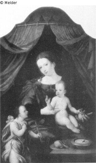 Under a canopy Madonna with child on her knees. To the left three quarter length figure of the infant John the Baptist. In the lower right corner is a plate with bread and gruel.
