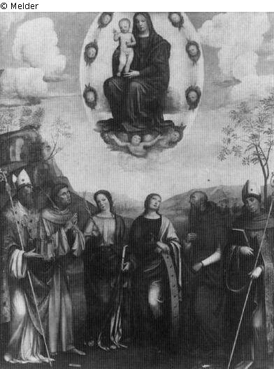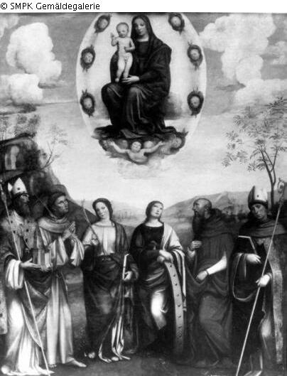 Maria mit dem Kind in der Glorie von sechs Heiligen verehrt