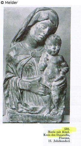 Die Madonna mit Kopftuch und Mantel, in Halbfigur, mit beiden Händen das aufrechtstehende Kind haltend. Ihr Kopf schmiegt sich an denjenigen des Kindes an. Auf Armband und Brustschließe Inschrift: Ave Maria. Der Kleidersaum mit Ornamentbändern. Rechteckiger Sockel. Florenz