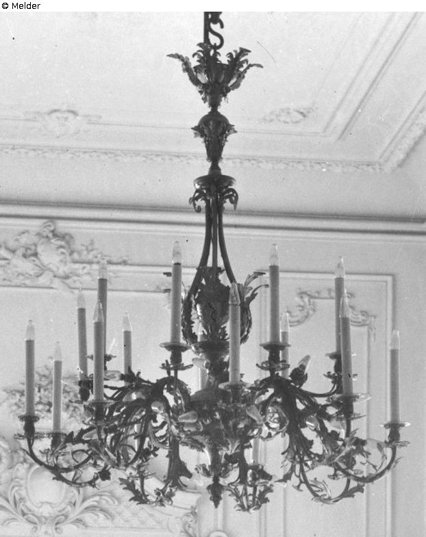 Es handelte sich um einen Metallkronleuchter mit 18 Brennstellen und einer üppigen zusätzlichen Ausstattung von Brennstellen, mit welchen der Kronleuchter im Zusammenhang seiner Elektrifizierung ausgerüstet wurde. Der Leuchter bestand aus einer Kombination von gegossenen und getriebenen Messingteilen (Akanthusblätter), welche wohl analog zu dem überwiegenden Bestand im Residenzschloss eine feuervergoldete Oberfläche hatten.