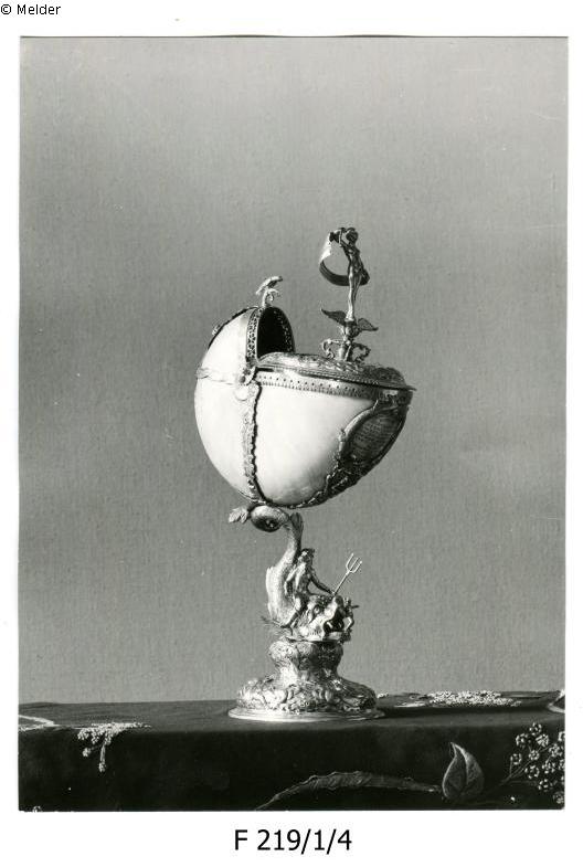 Meistermarke MA, Marke W, Breslauer Arbeit, ein fantastisches Meerestier, auf dem Poseidon mit Dreizack reitet und in dessen Maul ein Mann steht; der Schwanz des Tieres trägt die montierte Nautilusschale mit Deckel, darauf eine auf Flügeln stehende Frau mit fahnenartigem Gebilde in beiden Händen. Gravierung einer Inschrift auf der diademartig umgrenzten Vorderseite der Nautilusschale: a) "Ampliss: senatui Budissino concham hanc a soceros p.m. D. Andrea Cnöffelio, med.ol. regis Polon. Archiatro herdedt. jure sibi relictam officiosse offert. Tradit. M Oswaldt Nitsche senator CIƆCICLXV".