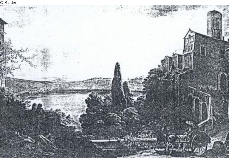 Blick von oben auf den blauen See, davor hochrangende Zypressen, rechts Gebäude. Im Vordergrund rechts ein Pferdekarren. Im Hintergrund weite Landschaft, lebhafter, z.T. bewölkter Himmel. Nicht bezeichnet. Goldrahmen