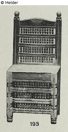In romanisierender Form. Die vier Seiten des Untergestells sowie die Fläche der Lehne sind zwischen kantigen Stollen dicht gefüllt von reihig gezogenen kleinen Gitterwerkbalustern. Quelle: Hugo Helbing Kunsthandlung und Kunstversteigerungshaus: Kunstbesitz eines Berliner Sammlers. Katalog Nr. 49; Math. Lempertz'sche Kunstversteigerung: Eine bekannte Süddeutsche Privatsammlung und anderer Privatbesitz, Katalog Nr. 395. (DOI: Externer Link) (DOI: Externer Link)