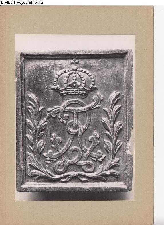 In gekehltem Rahmen das Monogramm „FWR“ Friedrich Wilhelm I. (König von 1713-1740) zwischen Palmenwedeln, darüber die preußische Königskrone.
